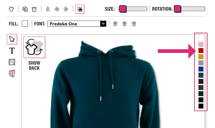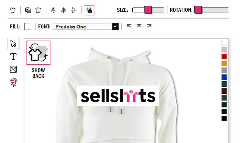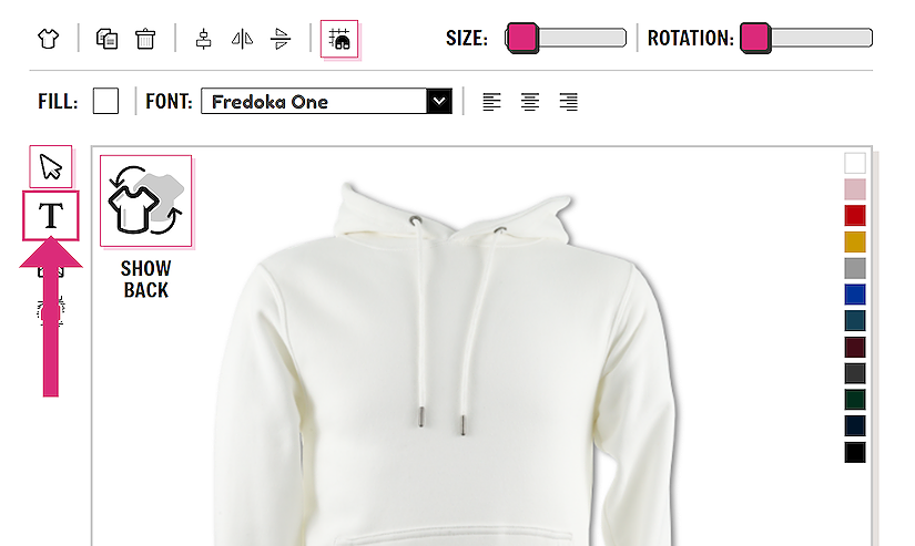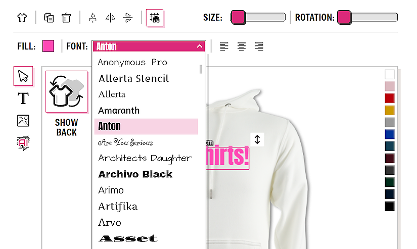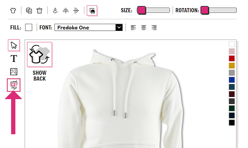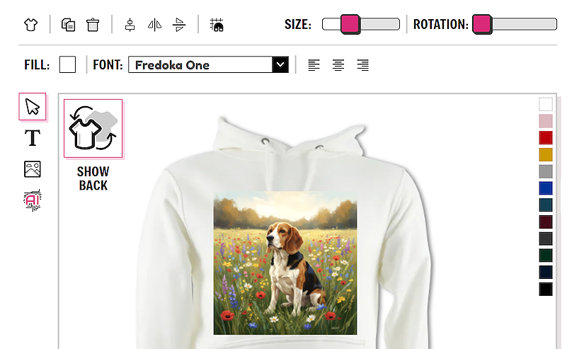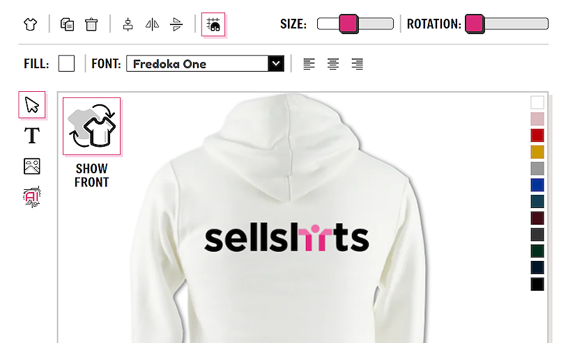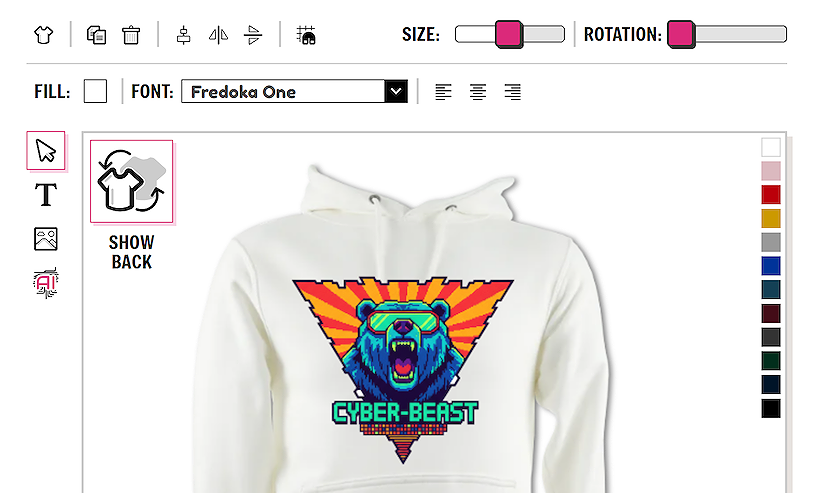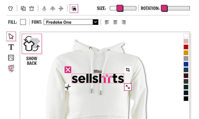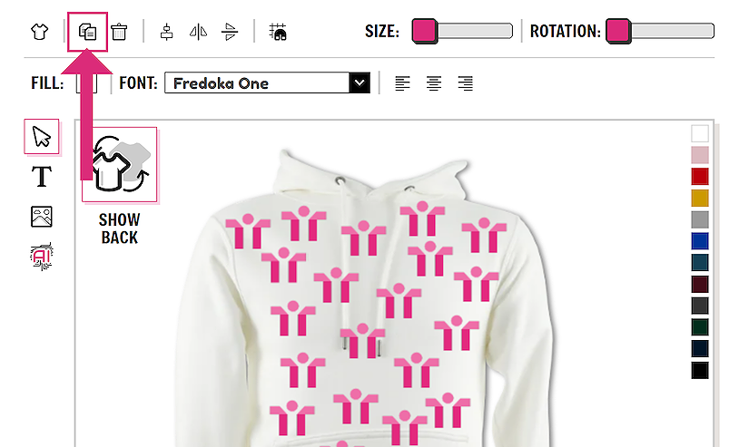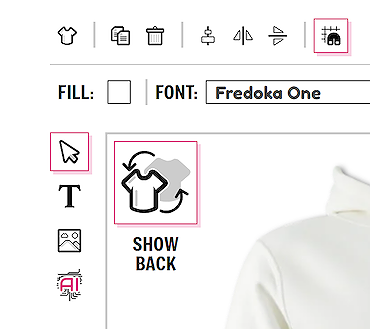 If you wish to design on the back of the garment you can easily toggle between the front and the back view using the SHOW FRONT / SHOW BACK button. There is no need to save the garment in between designing on the front and back. All information is saved.