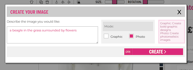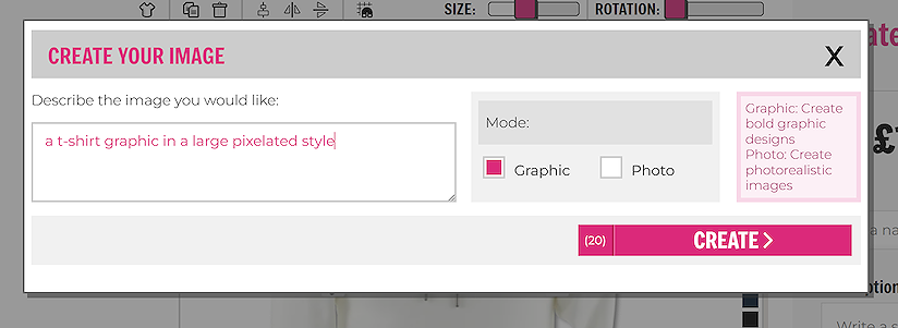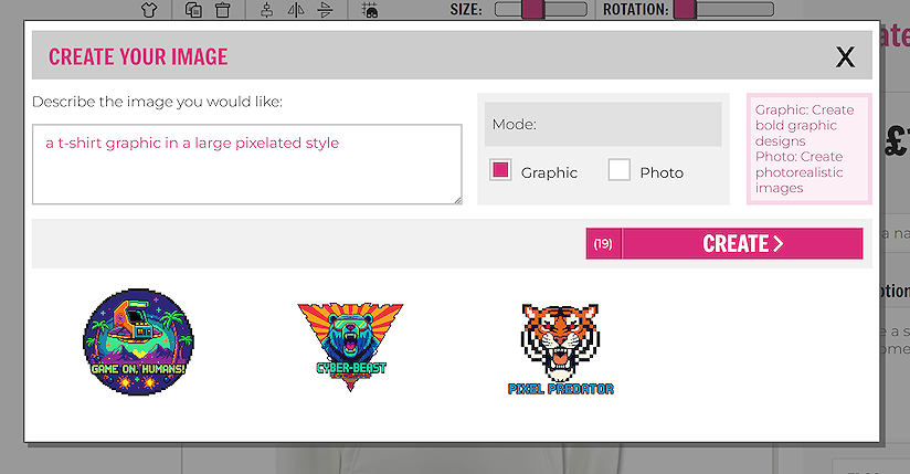 The graphic option is set by default, this creates bold, colourful designs suitable for t-shirt printing. Once you are happy with your prompt, click ‘CREATE’.