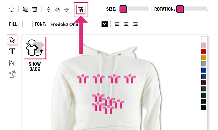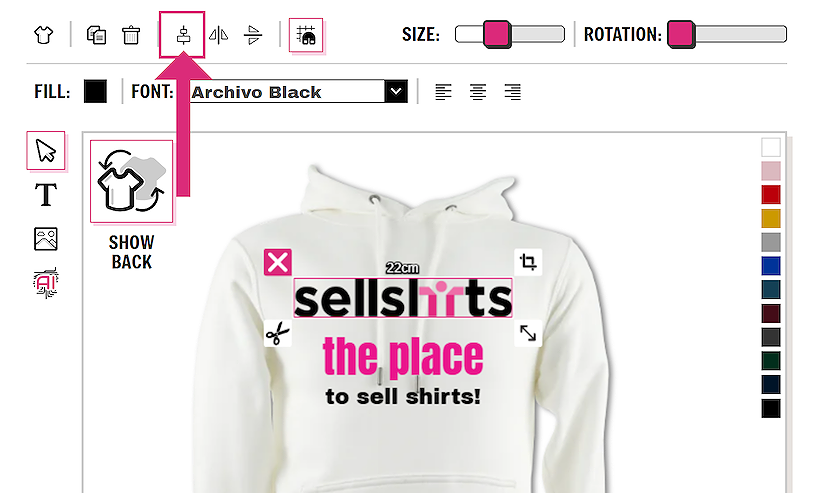 Images and text can be easily aligned on the garment. This is useful for centering items inline when you have multiple elements on the garment. Click on each element on the design and then click on the align to center button on the top of the designer. This allows all items to be aligned to the center and make the whole layout of the design look neater.