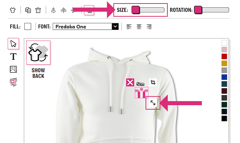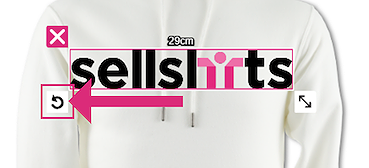 You can adjust the image size on the t-shirt by using the handles around the image. Notice the CM size at the top of the image, which shows the size of the print.