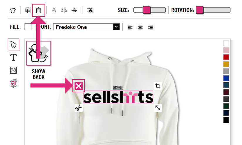 You can delete any element from your garment in two ways. First you can click on the item you want to delete, then click on the bin symbol at the top of the designer.