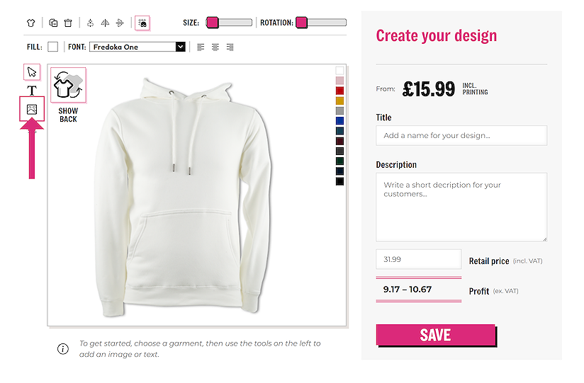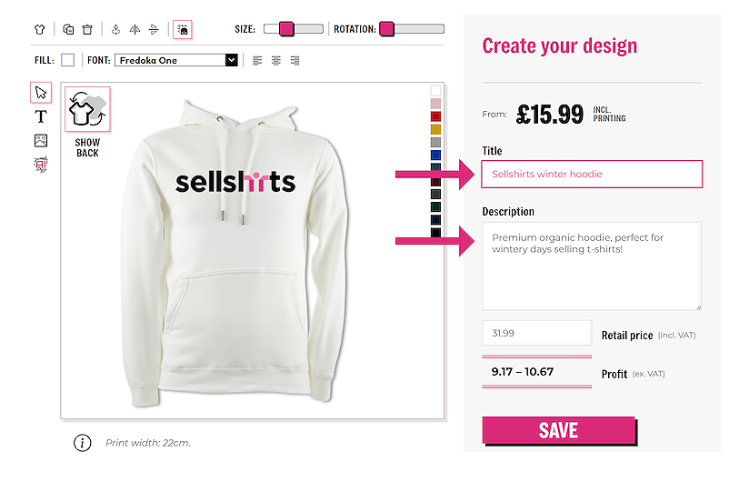 Once you are happy with your design, your resale price and your descriptions click the ‘SAVE’ button to add this design to your account. Don’t worry if it is not perfect, once saved, you will be able to edit your designs from your account area.