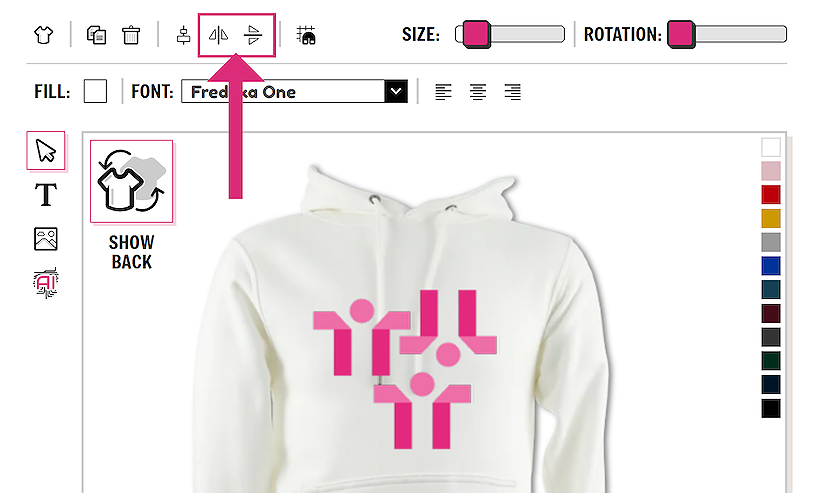 Sometimes in your design you may want to flip or mirror your design elements, this can be done using the tools at the top of the designer. They can flip an image or text either horizontally or vertically.