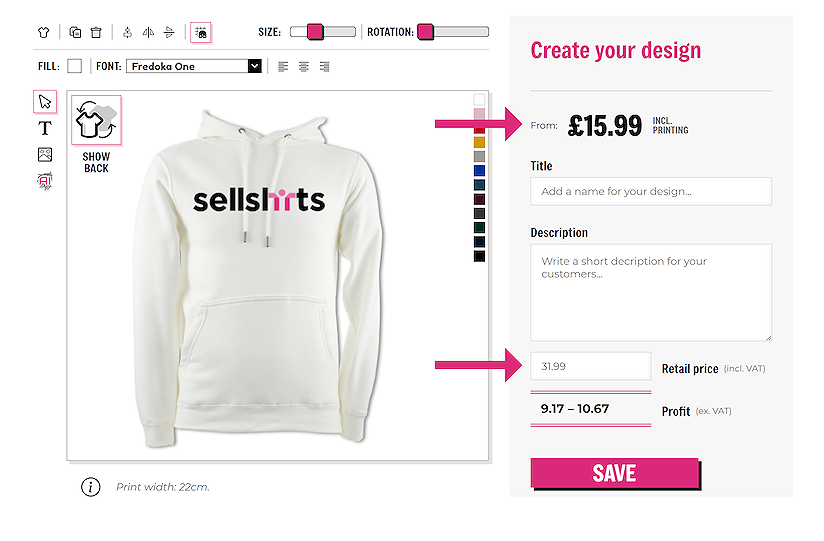 Once you are happy with your design and you are ready to save it to your account, you will need to think about the price which you want to sell it for.