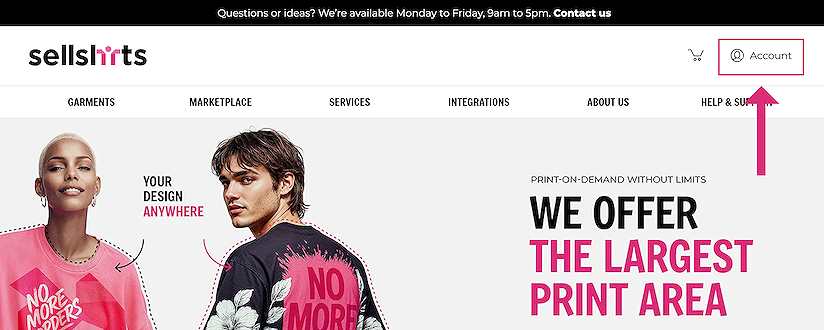 The first stage to get started is to create a sellshirts account. You can view the prices and play with the designer. However once you are at the stage where you want to save your designs you will need to sign up for a free account.