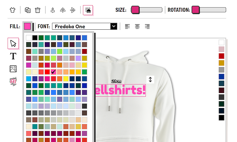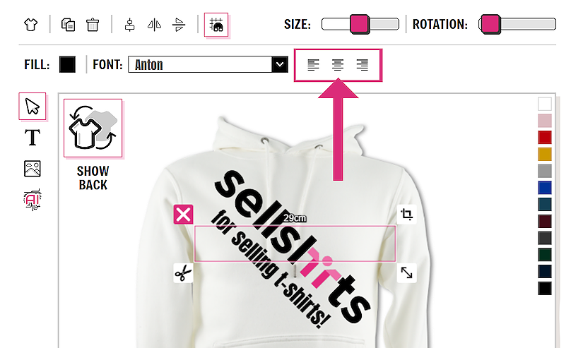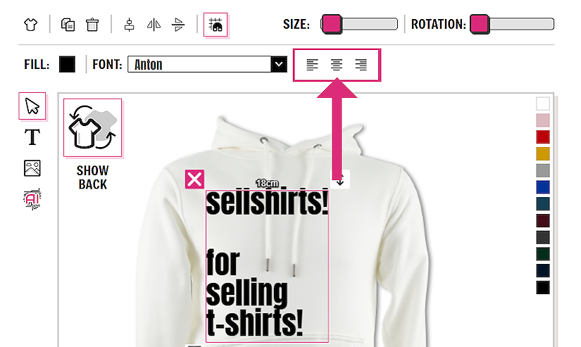 The default alignment for the text is center, this can be useful for centrally aligning all your items on the garment. However if you have a different text layout in mind, you can change the text alignment to left, right or center.