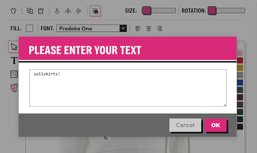 Add the text that you would like to the text box. Click ‘OK’ to add it to your garment.