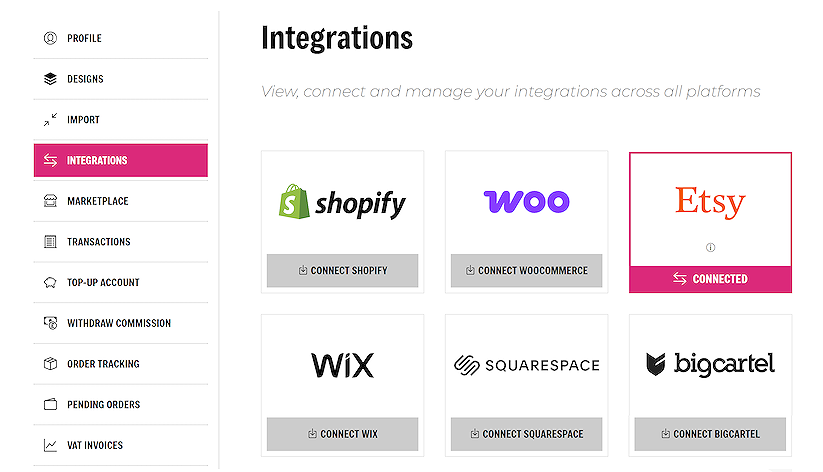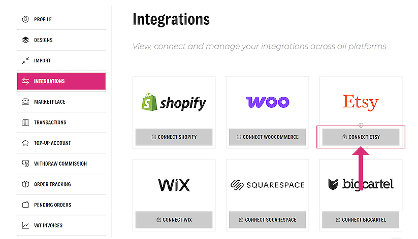Connecting your Etsy store with sellshirts is extremely simple. Navigate to the Integrations page, in your account area. On the Etsy section, click on the ‘CONNECT ETSY’ button on the integrations page.
