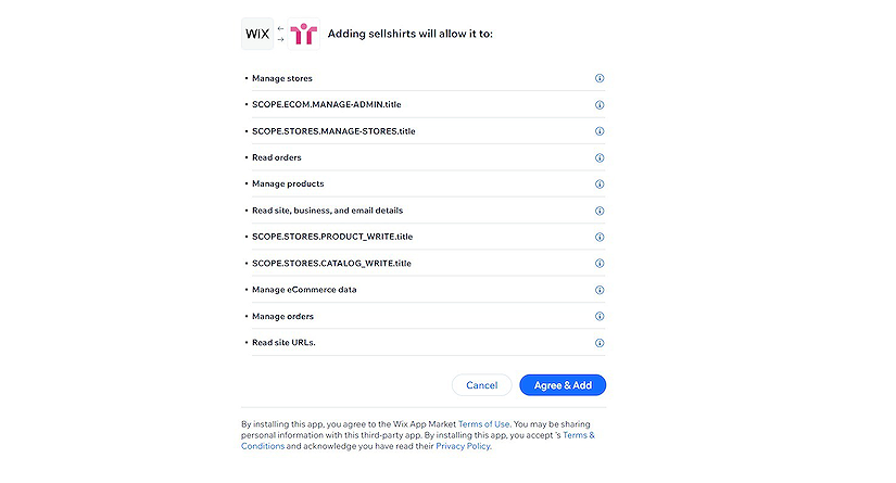 Agree and add the sellshirts connection to your Wix account