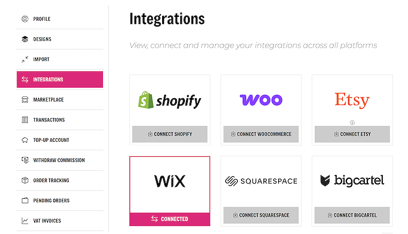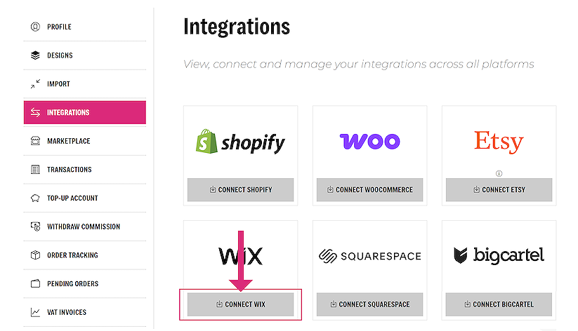 Connecting your Wix store with sellshirts is extremely simple. Navigate to the Integrations page, in your account area. On the Wix section, click on the ‘CONNECT WIX’ button on the integrations page.
